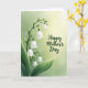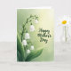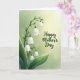 This card features a graceful botanical arrangement with a slender green stem rising along the left side, carrying clusters of small, white, bell-shaped blossoms that drape downward like a gentle cascade. The petals look slightly translucent, as if lit from within, and the leaves shift through soft emerald and lime tones that feel fresh and close, like a quiet walk beside someone you adore ❤️. Behind the flowers, the background fades from muted sage green near the left and bottom into a pale, buttery yellow toward the upper right, creating a tender, sun-warmed glow. Centered in that brighter area, a short message appears in flowing dark green lettering, with the words spaced comfortably so they don’t crowd the flowers. The curves of the text echo the bend of the stem, giving the whole layout a calm, affectionate rhythm, like two friends leaning in for a shared laugh 🌼. Subtle shading along each bloom adds depth, with soft highlights on the outer edges and gentle shadows tucked beneath the bells. The brightest light gathers in the upper right corner, while the tallest cluster of blossoms sits just left of center against the fading yellow.