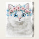 This design features a pretty white kitten wearing a pink and blue flower halo.