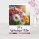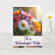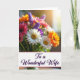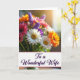 Designed with a lush bouquet of mixed blossoms, the card face is washed in a gentle, glowing light that feels like a quiet moment shared between partners ❤️. White, daisy-like flowers with golden centers sit front and center, surrounded by deeper pink blooms and bright orange florets that nestle close together like an affectionate embrace. Slender stems of small purple flowers rise through the arrangement, adding height and a graceful, reaching motion. Soft sunlight enters from the upper right, creating a faint flare and warm highlights that make the petals look slightly luminous. Near the bottom, a wide white banner stretches across the design, outlined by a thin rose-pink border. Centered on the banner, the message “To a Wonderful Wife” appears in flowing deep plum lettering, standing out clearly against the pale background 🌼. The upper-right corner shows the brightest glow, with a subtle flare drifting over the nearest white petals.