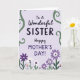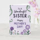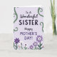 This card features a soft lavender background with a centered message that feels like a gentle hug between sisters ❤️. At the top, “To A Wonderful” sits in a flowing, cursive-style look, leading your eye down to “SISTER” in larger, heavier letters colored deep charcoal. Just below, “Happy MOTHER’S DAY!” appears in a mix of smoother lettering and sturdier capitals, set in a slightly softer purple that blends nicely with the backdrop. Along both vertical edges, curling green vines climb upward like an affectionate frame, adding a quiet, caring touch. A garden of stylized flowers spreads across the bottom, with many purple blooms mixed with white petals and small hints of soft orange 🌼. The petals are simple and rounded, and the flower centers use contrasting dots and shapes that make the bouquet feel lively without being loud. The overall layout stays balanced, with the text stacked neatly in the middle and the greenery and blossoms forming a natural border around it. The vines are emerald-toned and the flowers cluster densest along the lower edge, fading upward into open lavender space.