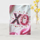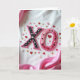 This greeting card features big “XO” letters that look like decorated sweets on a soft white background. The “X” is deep black with small white dots and star shapes, and it’s outlined with a textured fuchsia edging like piped icing. Next to it, the “O” has pink and deep red stripes, sprinkled with tiny stars and little red hearts, and it also has a ruffled pink outline. Scattered around the letters are small gold stars, white and blush hearts, and tiny white flower shapes that make the scene feel extra sweet. A bright pink satin ribbon drapes in from opposite corners, with shiny folds that frame the center. The lighting is gentle, and the slightly rippled white fabric behind everything gives it a cozy, romantic feel 🥰. It’s a simple way to say “hugs and kisses” without needing many words, and it’s perfect for sharing Valentine’s Day sentiments ❤️.