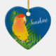 Pay tribute to your little buddy with this sweet lovebird ornament. A lutino peachfaced Agapornis Roseicollis sits at perky attention in all his yellow feathered splendor. Add your bird's name for a personalized heart shaped keepsake of your adorable forever friend. Parrot owners will love this trinket of avian affection to display on their tree or year round in a special spot for a sprinkle of birdie joy.