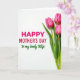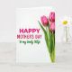 This card features a bright white background with three upright pink blossoms along the right side, their petals tightly curled like they’re just about to open 🌼. Slender green stems rise straight up, and the soft lighting leaves faint shadows that make the flowers feel gently sculpted. On the left, a large line of magenta text announces the occasion in thick, easy-to-read letters. Beneath it, a second line in lively green lettering curves in a looser, more flowing style, like a quiet note shared between close hearts ❤️. The wide open white space between the text and flowers gives everything room to breathe, like two friends standing side by side without needing to crowd each other. The strong contrast of pink petals and green stems against the white field keeps the layout simple while still feeling affectionate and close. The three blossoms sit in a neat vertical cluster near the right edge, with the greeting aligned on the left and plenty of blank space in between.