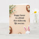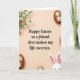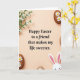 This greeting card features a soft peach‑beige background with black serif text centered on the page that reads, “Happy Easter to a friend that makes my life sweeter.” The wording sits in the middle with generous spacing around it, giving it an easy, intimate feel, like a note shared between close friends. In the top-left corner, a small spray of white flowers and fresh green leaves leans inward, as if gently reaching toward the message 🌷. Around the outer edges, several dark brown egg-shaped treats are placed like a loose frame, each decorated with simple white daisies and bright yellow centers. The floral accents and candy-like shapes create a cozy, affectionate scene without crowding the text. At the lower right, a cute bunny peeks up into view 🐰, with tall ears lined in soft pink and small dark eyes that seem to look toward the greeting. The bunny’s head is only partly shown, with the ears and face emerging from the corner against the pastel backdrop.