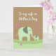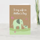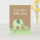 This greeting card shows two stylized elephants in muted sage green, standing close together as the smaller one reaches its trunk toward the larger in a tender, trusting gesture ❤️. The larger elephant stands on the left with darker gray-green patches on its ears, while the smaller companion stands on the right in matching tones. Small orange accents color their feet, adding a gentle pop against the soft palette. Behind them sits a warm, earthy brown backdrop with rolling hills layered in light green shades that fade from darker to lighter as they rise. Near the top, a short message in white lettering is centered and easy to spot against the darker background. A few pink butterflies with dark outlines float above the pair, adding a light touch like a quiet shared moment 🌼. One butterfly at the upper right follows a curved dashed trail that arcs through the air.