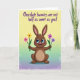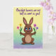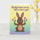This card features a cartoon-style rabbit in warm brown tones sitting in the lower half, looking up with big blue eyes and a wide smile that shows a tiny pink tongue 🐰. Soft purple blush on its cheeks and the gentle tilt of its head give it a sweet, friendly charm, like it’s offering a small crush-worthy hello. In each paw, it holds a little bouquet of stylized flowers in soft pink, sunny yellow, and light purple, with slim green stems that cross neatly near its chest 🌷. Across the top, the message “Chocolate bunnies are not half as sweet as you!” is written in flowing purple lettering, centered and easy to read. The background fades from pale butter yellow at the top into a light mint green band through the middle, then settles into a calm lavender near the bottom. Faint, cloud-like textures float through the gradient, keeping the scene soft and airy. The rabbit’s smooth outlines stand out against the watercolor-like wash, and the bouquets add small pops of color near the lower center.