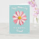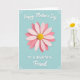 Designed with a calm pastel aqua background, this card centers on a tall, multi-petaled flower that feels like a gentle hug between close friends ❤️. The petals alternate between pale pink and deeper rose tones, and the soft shading makes them look lightly brushed by warm daylight. In the middle, a textured golden-yellow center glows like a small sun, adding a cozy, caring touch 🌼. Near the top, the words “Happy Mother’s Day” appear in white flowing lettering, placed above the flower so the greeting feels like it’s floating. Below the bloom, “TO A BEAUTIFUL Friend” is set in a mix of simple uppercase letters and matching white flowing lettering, stacked neatly for emphasis. A thin white line frames the whole design, giving it a gentle, thoughtful finish. In each corner of the border, small curled line details decorate the frame in white.