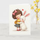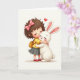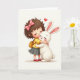 This card shows a curly-haired child hugging a fluffy white bunny close, their cheeks touching with the kind of gentle closeness you’d see between best friends. Set against a soft ivory background, the pair sits centered with lots of open space that keeps your eyes on their quiet connection 🐰. The child wears a bright pink bow in deep brown curls, a sunny yellow top, a simple gray pleated skirt, and shiny red shoes, and her eyes are closed as she leans in. The bunny has long ears with pale pink inner details and a small, closed-eye smile, as if it’s leaning back into the cuddle 🐇. A single red heart floats just above their heads, adding a romantic little accent without needing extra details. Both faces have a light rosy blush, and the shading suggests soft hair strands and downy fur through gentle gradients. There is no text on the front, leaving the red heart and pink bow as the strongest color notes against the ivory backdrop. The only graphic above them is that small red heart, hovering slightly to the right of center.