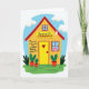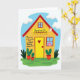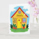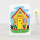 This card shows a flat, front-facing house illustration centered on the cover, with a sunny yellow front wall and a red peaked roof under a bright blue sky with a few soft, rounded clouds. The ground is a rich green strip, and a couple of simple potted plants sit near the walls, adding a cozy, lived-in touch. Across the middle of the house, the message appears in dark lettering, with “GRANDMAS” set larger so it stands out, and the rest of the line arranged neatly above and below it. In one window, a single figure with pink hair and a gentle smile looks outward, like they’re watching for loved ones arriving with flowers 🌼. A small red heart ❤️ sits on the yellow door, turning the entryway into a quiet sign of affection and closeness. The artwork has a lightly speckled texture that softens the solid colors and makes the scene feel warm without being busy. Near the top of the sky area, a small crescent moon is tucked in as an extra detail above the roofline.