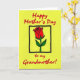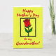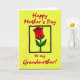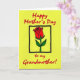 This card features a bright yellow background that makes the design feel sunny and affectionate ❤️. Across the top, the text reads “Happy Mother’s Day” in red, flowing lettering that stretches neatly from left to right. At the bottom, a second line in matching red says “to my Grandmother!” with the words centered and spaced to feel like a warm sign-off. In the middle, a black square frame holds a single red rose, drawn with simple petal shapes and thick black outlines that give it a crisp, graphic look. Two green leaves and a slim green stem sit beneath the bloom, also edged in black, like a small bouquet offered with care 🌼. The strong contrast of red, green, and black against yellow creates a confident, poster-like style that keeps your eye moving between the message and the flower. The rose sits centered inside the square, with the petals angled slightly upward and the leaves fanning out to either side.