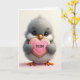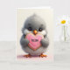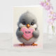 This card shows a plush, bird-like creature centered in the scene, with rounded gray-and-white feathers that look extra soft and a sweet, steady gaze that feels quietly affectionate ❤️. Its large dark eyes have tiny lashes, and its bright orange beak and small matching feet add a cheerful contrast against the gentle palette. With its little paws held close, it offers a heart-shaped cookie as if sharing a shy, friendly gift across the space. The cookie is coated in smooth pink icing, edged with fine white swirls, and it carries a short love-and-thanks message in small dark lettering across the middle. The main text sits on the cookie rather than the background, with the dark letters standing out clearly against the pink surface. Soft, diffused lighting rounds out the fluffy texture and gives the icing a light sheen, like a quiet moment between close companions 🌼. Behind everything is a creamy off-white backdrop that fades into a faint pink blush near the bottom edge.