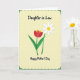 This greeting card features a pale lime-green background with a faint repeating pattern of tiny shapes, framed by a scalloped inner border and a deeper green outer border dotted with small white circles. Near the top, a large term of familial endearment appears in a friendly, flowing style in dark green, centered within the frame. Below it, two flowers rise from the lower third, leaning slightly toward each other as if sharing a quiet, affectionate moment ❤️. On the left sits a red, cup-shaped bloom with golden accents inside, supported by broad green leaves. To the right, a white, star-like flower spreads multiple petals around a sunny yellow center, its stem curving gently toward its companion 🌼. The stems are slender and deep green, creating a unified, garden-like pairing. At the bottom, a short seasonal greeting is set in smaller dark-green lettering, centered just above the dotted border, while tiny green motifs repeat along the edge.