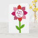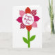 Designed with a simple, friendly style, this card features a single flower emblem centered on a bright white background, like a small token of affection shared between close friends or sweethearts ❤️. The bloom is made of rounded, oval petals arranged in a neat circle, with pinks, reds, and deep fuchsia creating a cozy patchwork look. Some petals show tiny white stars on red, others have soft check patterns in lighter pink, and a few include small dotted motifs that add gentle texture. In the middle, a white circular center holds a short celebratory message in flowing lettering, set in a dark ink for clear contrast. A slim green stem drops straight down from the flower, giving the design a calm, balanced feel. Two curved green leaves spread out near the base, adding a fresh touch like a quiet garden moment 🌼. The lighting stays even and bright, keeping the colors crisp and the shapes easy to see. The flower’s center text sits inside the white circle, framed by the ring of patterned petals above the thin green stem and two leaves.