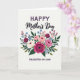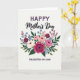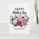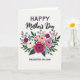 This card features a full, layered bouquet centered on a soft off-white background, with flowers arranged close together like a gentle embrace ❤️. At the top, the word “HAPPY” sits in uppercase deep plum letters, and just beneath it “Mother’s Day” appears in a darker flowing cursive style that feels like a tender note. The largest bloom is a multi-petaled magenta flower with velvety texture and a dark center, drawing the eye the way a loving glance draws two people together. Around it are soft pink peony-like blossoms, creamy white rose-like flowers, and tiny blue and pink accents that mingle closely, suggesting warmth and closeness. Deep green leaves and slender sprigs curve outward, adding a calm, protective frame to the arrangement 🌼. Near the bottom, “DAUGHTER-IN-LAW” is centered in the same deep plum uppercase lettering, balancing the design from top to base. The lighting looks softly diffused, giving the petals a gentle glow and subtle shadows between layers. The bouquet shows magenta, blush pink, cream, light blue, and rich green tones against the pale background.