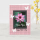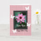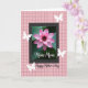 This card features a large water blossom opening wide, with layered petals shifting from deep fuchsia at the center to a soft blush at the edges, like a quiet love note in flower form ❤️. Behind it, slightly blurred green leaves create depth and make the pink tones feel even more tender. The floral image sits inside a dark rectangular frame that gives the design a calm, grounded structure. Outside the frame, a pastel pink background is covered in a lightly sketched plaid pattern that feels cozy and homey. Four white butterfly silhouettes float around the framed flower, as if circling in a gentle, affectionate dance 🌼. A short line of text appears in white near the lower portion inside the dark frame, while a longer message is placed below the frame in black, flowing lettering directly on the pink plaid. The overall layout keeps the flower centered, with the butterflies spaced around it and the black message aligned beneath on the textured pink field.