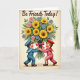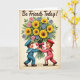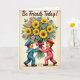 Designed with a vintage-style look, this card features a softly worn, parchment-toned background that feels cozy and familiar. A large bouquet fills most of the scene, mixing sunny yellow flowers with smaller pink blooms and cool blue-purple petals tucked among rich green leaves 🌼. A bright fuchsia ribbon wraps around the stems, drawing your eye to the base where two youthful, cartoon-like figures stand close together. One wears a sea-inspired blue outfit with a matching cap and a white-striped collar, while the other wears a red outfit with white trim and a coordinating hat. Their round faces show rosy cheeks and wide smiles, and their hands meet around the bouquet as if offering it together with affectionate teamwork ❤️. Near the top, a short message appears in dark ink, centered above the flowers and spaced to leave plenty of open background around it. The bouquet’s stems are gathered tightly under the ribbon, with layered petals fanning outward against the lightly frayed edges of the backdrop.