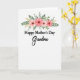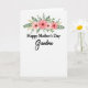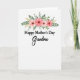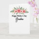 This card features a tender floral arrangement arching above a loving message, setting a gentle, affectionate tone ❤️. On a bright white background, four blossoms sit near the top center, painted in soft washes that shift from peach to coral-pink with darker centers for depth. Curving green leaves weave around the flowers like a loose crown, and small golden sprigs add a warm glint that feels like a quiet hug between family. The main wording is stacked in the middle-lower area, with “Happy Mother’s Day” in crisp black letters that look classic and respectful. Just beneath it, “Grandma” appears larger in a flowing, cursive style, as if written with extra care for someone dearly loved 👩. The spacing leaves plenty of airy white space, letting the romance of the colors and the tender contrast in lettering feel calm and close. The palette stays soft and natural, with peach, coral-pink, leafy green, and touches of gold against the white. The top cluster shows four peach-to-coral blooms with dark centers, surrounded by layered green leaves and fine golden sprigs.