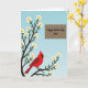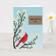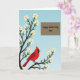 Designed with a gentle spring scene, the card shows a sturdy tree with dark branches stretching up the left side, dotted with small white blossoms with yellow centers 🌼. Against a soft blue sky that fades from deeper to lighter tones, a bright red bird with a black face marking and an orange beak rests on a lower branch, angled as if pausing to watch over someone with quiet care ❤️. The blossoms cluster around the bird, giving the moment a tender, companionable feel, like a calm pause shared between loved ones. In the upper-right area, a neat brown rectangle creates a clear space for the message without crowding the artwork. The text reads “Happy Mother’s Day Omi,” set in smooth, flowing lettering in a light color that stands out against the brown panel. The layout keeps the tree and bird as the main focus while the message sits comfortably off to the side. The bird’s crimson feathers and the blossoms’ pale petals contrast gently with the cool gradient sky and the earthy message panel. The final detail is the rectangular brown text box positioned in the upper right, with the greeting centered inside it.