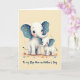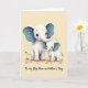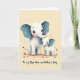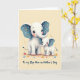 This card shows a sweet digital illustration of two white, plush-like elephants, with a larger motherly figure leaning close to a smaller companion as their trunks curl toward each other in a tender, affectionate gesture ❤️. Soft shading gives their rounded bodies a gentle 3D look, and their rosy cheeks and wide, sparkling eyes suggest a trusting bond. A warm, pale yellow glow fills the scene, bathing everything in light and giving the moment a cozy, loving feel. Their oversized ears have teal inner panels decorated with tiny flowers in sky blue, soft pink, and sunny yellow, adding a delicate, romantic touch 🌼. The pair sits centered with plenty of breathing room around them, keeping all attention on their close, caring pose. Along the bottom edge, a Mother’s Day message is placed in a simple, easy-to-read style in a darker tone that stands out against the light background. Near their feet, small blossoms and little star shapes are scattered across the ground in matching pastel colors.