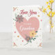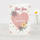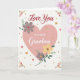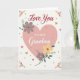 This card centers on a large blush-pink heart that feels like it’s holding a quiet, affectionate moment between two people. Inside the heart, the main message sits in flowing lettering, with smaller, easy-to-read text tucked beneath it, both in a soft gray tone. Around the heart’s edge, stylized flowers and leaves curl gently, as if leaning in close like friends sharing a secret ❤️. The palette stays calm and romantic with muted rose, soft golden yellow, and sage green set against a creamy white background. Lavender-gray blossoms mix with sunny yellow petals, connected by thin green stems that give the artwork a light, airy rhythm. Tiny gold dots are scattered across the design like confetti, alongside a few small red hearts that add a sweet spark 🌼. In each corner, small floral clusters echo the main bouquet, framing the heart with balanced, delicate detail.