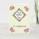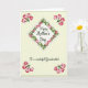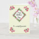 This card shows a pale yellow‑green background with a diamond-shaped frame in the center, wrapped in a thin vine of small flowers and leaves that feels like a gentle hug ❤️. The flowers look like soft tulip buds in blush pinks and warm reds, with slender green stems that curl inward as if leaning close. In the middle of the diamond, the main line “Happy Mother’s Day” sits centered in a flowing, dark gray style, giving the words a tender, affectionate look. Just below it, “To a wonderful Grandmother!” appears in a smaller size, also centered, in a matching dark tone that keeps the focus on the message. Each corner carries a small cluster of the same buds and leaves, like little bouquets placed to frame the note without crowding it 🌼. The shading is light and watercolor-like, with soft edges that make the petals seem freshly brushed onto the paper. The overall layout feels balanced and calm, with the vine forming a neat border that guides your eyes toward the center. The four corner clusters show two to three pink buds each, surrounded by bright green leaves and thin stems angled diagonally toward the diamond.