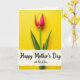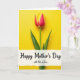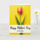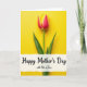This card features a single spring flower centered on a wide field of luminous yellow, drawing your eye straight to its gently curving petals. The petals shift from a deep pinkish red near the middle into a soft yellow along the edges, like a tender blush shared between close loved ones ❤️. A slim green stem drops downward with a couple of pointed leaves, adding a calm, natural balance to the bright background. The lighting looks smooth and even, keeping the colors rich without harsh shadows and giving the scene a sunny, affectionate glow. Across the lower third sits a white banner with slightly rough, torn-looking edges, creating a cozy, intimate touch. The main line of text, “Happy Mother’s Day,” is placed prominently on the banner in dark lettering, with “with lots of love” in smaller type tucked just beneath it 🌼. The banner stretches horizontally near the bottom while the flower remains upright and centered above it. Behind everything, the background stays a solid, radiant yellow with no other objects or patterns.