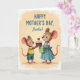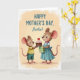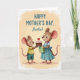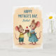 This card shows two friendly, human-like little rodents facing each other in a cozy, affectionate moment, with a gentle closeness that reads like family love ❤️. The smaller one wears a yellow-and-blue striped top with deep green shorts and leans forward, offering a tiny chocolate cake topped with pink frosting and a red heart. The taller one, dressed in a light blue apron over a white shirt with a soft pink collar, tilts her head with warm eyes and a tender smile as she accepts the treat. A folded green checkered cloth rests in her hand, adding a homey touch that suggests shared care and time together. The background is a creamy golden-beige wash with soft, cloud-like brush marks, and both characters have rosy cheeks and fine fur details that make the scene feel gentle and close 🌼. Near the top, a short line of friendly lettering sits centered above them in a darker tone that stands out against the pale backdrop. The cake sits between their paws, with the pink frosting swirled neatly and the bright red heart centered on top.