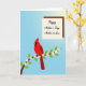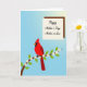 The front design shows a bright red bird with a pointed crest and an orange beak perched calmly in the lower left, its steady pose suggesting a quiet closeness with the spring scene around it ❤️. A dark, gently curving branch runs along the bottom, like it’s offering the bird a safe place to rest. Fresh green leaves and small white blossoms dot the branch, each flower showing a soft orange center that feels like a gentle nod between friends 🌼. Behind everything, the background fades from medium sky blue to a lighter, sunnier blue toward the upper right, keeping the mood airy and open. In that upper right area, a light tan rectangular message panel sits neatly, outlined with a darker brown border. A short greeting appears centered on the panel in flowing dark ink, standing out clearly against the pale background. The blossoms cluster most densely near the branch’s middle, while the message panel stays clear of leaves and flowers for an uncluttered look.
