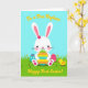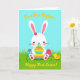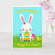 This card features a bright spring illustration centered on a white bunny with pink-lined ears, rosy cheeks, and a small magenta flower by one ear 🐰. The bunny gently hugs an oversized egg, and its soft, close posture gives the scene a sweet, friendly closeness. The main egg has wide horizontal stripes in orange, yellow, green, and blue, with small white starburst shapes sprinkled across each band. To the left and right sit two decorated eggs: one turquoise with simple white floral shapes, and one fuchsia with evenly spaced dotted lines 🐇. Along the top edge, a short greeting appears in warm golden lettering, and a second line of matching golden text sits near the bottom above the grass. The foreground is a rich green lawn with a few small yellow flowers, and a tiny yellow chick with an orange beak stands on the right as if watching the bunny. Behind them, the backdrop is a clear cerulean sky with flat, smooth color and crisp outlines.