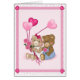 Teddy bears. The little girl bear has a bouquet of balloon hearts and pink roses. The little boy teddy bear is gazing at her with love. Customize the inside area with your greeting and signature..Card has romantic verse inside.