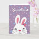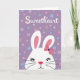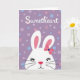 This card features a vertically oriented illustration with the word “Sweetheart” placed across the top in white lettering against a soft lavender background. Below the text, a white bunny peeks up from the bottom edge, as if leaning in close like a shy friend or affectionate partner 🐰. The bunny’s long ears have gentle pink inner shading, and one ear wears a pink bow with small dots and a tiny blue jewel at the center. Its face is minimal yet tender, with a small pink nose, a slight curved mouth, thin black whiskers, and eyes drawn with simple upward lashes that suggest a bashful glance 🐇. The background is sprinkled with floating circles in light blue, soft pink, and pale lilac, mixing solid and outlined shapes for a confetti-like look. These dots drift around the bunny and the text, giving the scene a light, celebratory feel that pairs nicely with the affectionate wording. Along the lavender field, the scattered circles vary in size and pattern, with a few pale outlines overlapping near the upper corners.