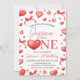 A sweetheart-themed first birthday invitation featuring red watercolor hearts, bows, and elegant typography. Designed to celebrate a little one turning one, this invitation is perfect for sweet, heart-themed, or girly first birthday parties. Coordinates beautifully with matching party décor.