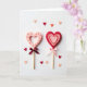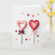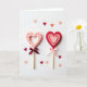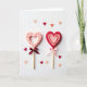 This design shows two heart-shaped lollipops placed on a plain white background, with a few small heart confetti pieces scattered around. The left lollipop is a light blush pink heart with a heart-shaped cutout in the center, and it has a border of tiny red hearts all around the edge. A dark burgundy ribbon is tied neatly near the wooden stick, adding a cozy, romantic touch ❤️. The right lollipop is a deep red heart with a layered look, showing smaller hearts inside that fade from red into softer pink toward the middle. A light pink ribbon is tied at the base of its stick, giving it a gentle, sweet finish 💕. Around them, the confetti hearts in red, orange, and peach add a fun, love-themed sprinkle across the white surface. There isn’t any printed text visible on the card in this image, so the focus stays on the candy hearts and their colors.