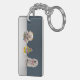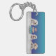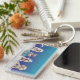 A delightful keychain for the dog lover or pet parent in your life. One side is a blue and purple gradient background with three mischievous pups eyeing a carousel of cupcakes. The other side is a grey gradient background with an adorable Maltipoo pup having all the candy and still eyeing the colorful cake while the Maltese Shih Tzu has but one candy for him.