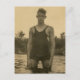 This postcard features a vintage photograph of a handsome young man in a 1920s bathing suit. He is standing in a lake posing for the photographer.