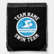 A fun customizable drawstring backpack for swimmers, swim teams and coaches, with custom text boxes where you can type in your own swim team name or any other text (school name, slogan, mascot, etc.). These make fun and useful gifts for swimmers, coaches and fans at all levels of competition, from youth through varsity high school and college swimming stars!