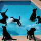 Silhouetted dogs playfully leaping and splashing in a bright blue swimming pool.