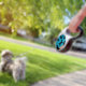 Silhouetted dogs playfully leaping and splashing in a bright blue swimming pool.