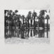 Black and white fire hydrant sitting next to a lake surrounded by palm trees.