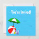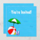 Custom party invitations with a fun swimming pool theme, decorated with a red beach ball, green umbrella, sandals and suntan oil on a watery blue background with curly waves. Click Customize It to change fonts or colors.