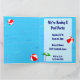 Custom party invitations with a fun swimming pool theme, decorated with a red beach ball, green umbrella, sandals and suntan oil on a watery blue background with curly waves. Customize it to change fonts or colors, even save your design for later.