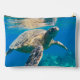 Underwater photograph of a sea turtle swimming in crystal clear water just below the surface.