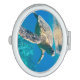 Underwater photograph of a sea turtle swimming in crystal clear water just below the surface.