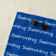 Swimming Tiled Text Design Beach Towel with customizable background color and tiled text. Text can be changed or deleted.