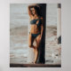 A swimsuit model in a swimsuit leans against a pier column. She gazes toward the ocean, with waves softly crashing on the shore.