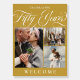 Wedding anniversary welcome sign for a 50th wedding anniversary celebration with a white swirly calligraphy script on golden yellow and a minimal photo collage with three photos of different sizes where you can give your guests a glimpse of your wonderful fifty years together!