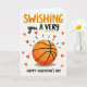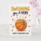 This cool greeting card blends warmth, love, and a basketball theme in a cheerful way. At the center is a bright orange basketball painted in soft watercolor tones, complete with gentle shadows and a light highlight that gives it depth. Dashed lines around the ball suggest motion, like a perfect shot, leading up to the word “SWISHING” written in bold orange lettering at the top. Small red hearts float nearby, each slightly different, adding charm and personality. Supporting phrases in black cursive and block lettering complete the message, set against an off-white background that feels like textured paper. The mix of colors and details creates a heartfelt card that’s perfect for a basketball fan.