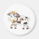 A round refrigerator magnet with the illustration of a white and black Swiss cow wearing a Swiss cow bell around her neck and chewing on a yellow wild flower . © ArianeC Illustrations