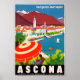 Restored and digitally enhanced vintage travel poster showing the port area of Ascona with boats and sunbathers. Imperfections removed. Colors corrected.