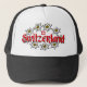 This cap is available in several styles and colors with Switzerland in red type with the Swiss flag are surrounded by edelweiss